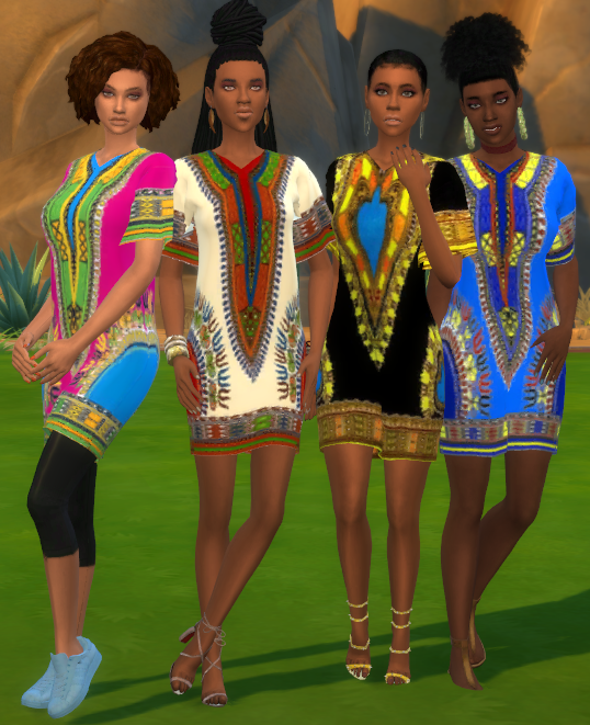 This is my very first custom content for the Sims 4!!! The mesh was made by me and I added four Dashiki textures. I also included two African inspired formal-wear print.